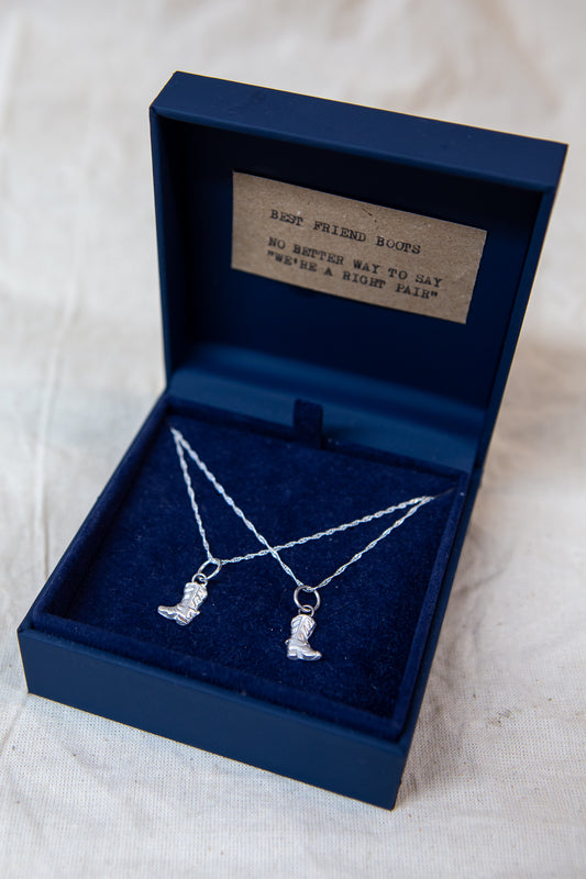 A fine silver cowboy boot necklace each for you and your bestie. Because you're a right pair.